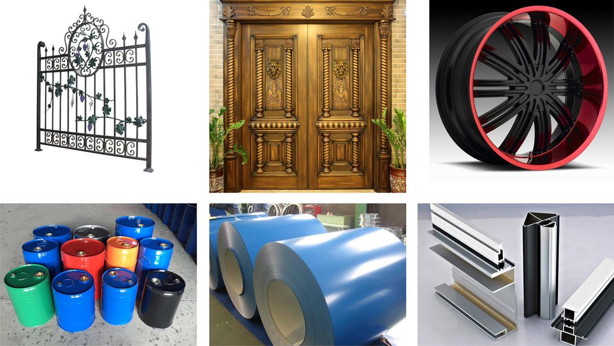 五金家電、金屬門窗、五金燈具、農(nóng)用機械、車輛等金屬基材的裝飾保護;典型實用案例有:鋼桶、輪轂、卷鋼、鋁型材、五金件、汽車、自行車、電動車、鐵藝攔柵、防盜門、發(fā)動機蓋、寫字白板等的涂飾。