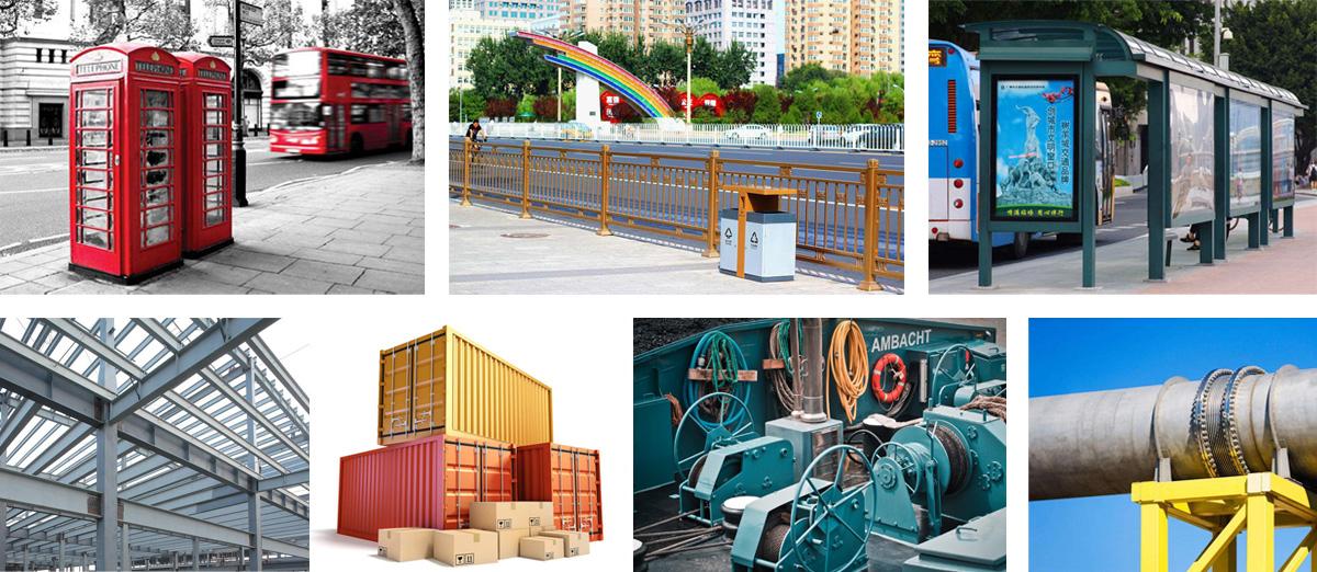 鋼結(jié)構(gòu)、機(jī)械設(shè)備、管道、鑄鐵部件、公共設(shè)施、集裝箱等金屬基材的防銹飾面。